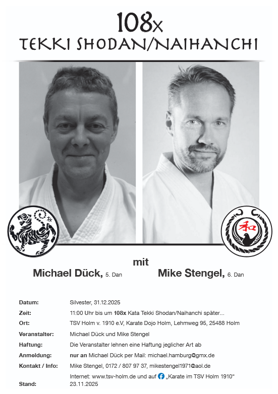 zwei Jahre sind vergangen und somit bieten wir Euch erneut ein Silvestertraining in Holm um 11:00 Uhr an mit dem Ablauf von 108 x Kata Tekki Shodan (für Shotokaner) bzw. Naihanshi (für Wado-Ryuaner) unter der Leitung von Mike Stengel und Michael Dück. Dieses Training ist offen für alle, aber wir bitten wegen der Übersicht um eine Anmeldung per Email an This email address is being protected from spambots. You need JavaScript enabled to view it..