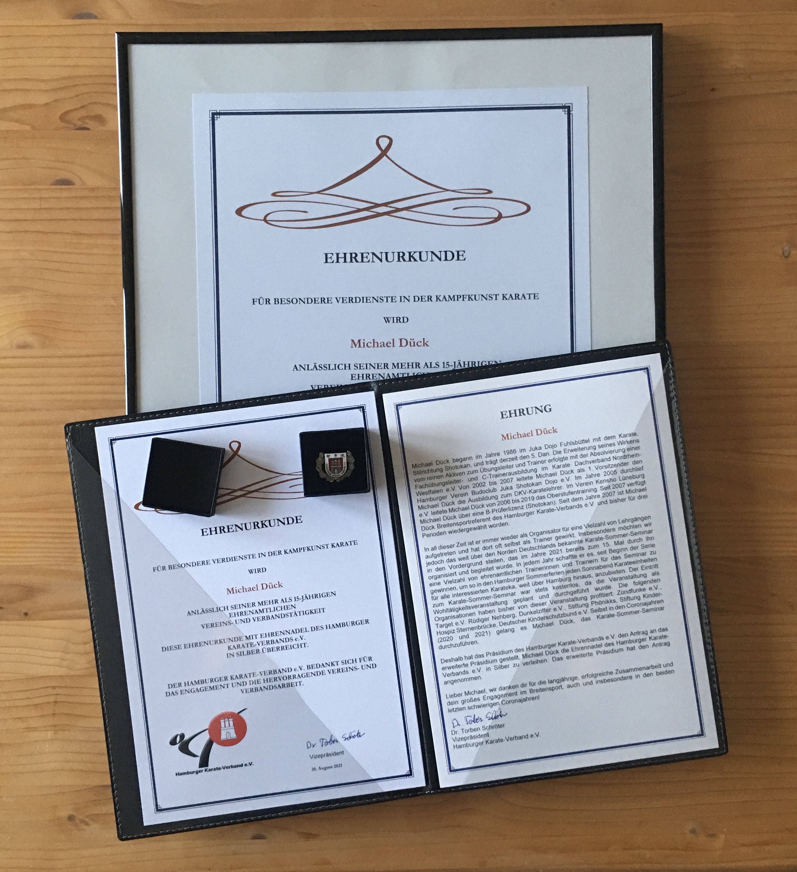 Ehrung mit der silbernen Ehrennadel des Hamburger Karate-Verbands e.V. (LINK) für die ehrenamtliche Verbandsarbeit (JPG) im Rahmen des HKV-Verbandstag am 08.09.2021 Urkunde, Begründung und Nadel |